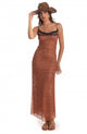Abito lungo aperto con coulisse in vita in tessuto rete double face. Abito lungo aperto con coulisse in vita per una vestibilità personalizzata e piccole coulisse che regolano l'ampiezza della spallina. Il design double-face rende l'abito ricercato e unico creando una combinazione di colori vivaci e seducenti. Un lato presenta un'elegante sfumatura mentre l’altro una stampa ispirata ai paesaggi del Far West. La bordatura a contrasto ricamata a punto ventaglio conferisce un tocco di arigianalità e raffinatezza al capo.